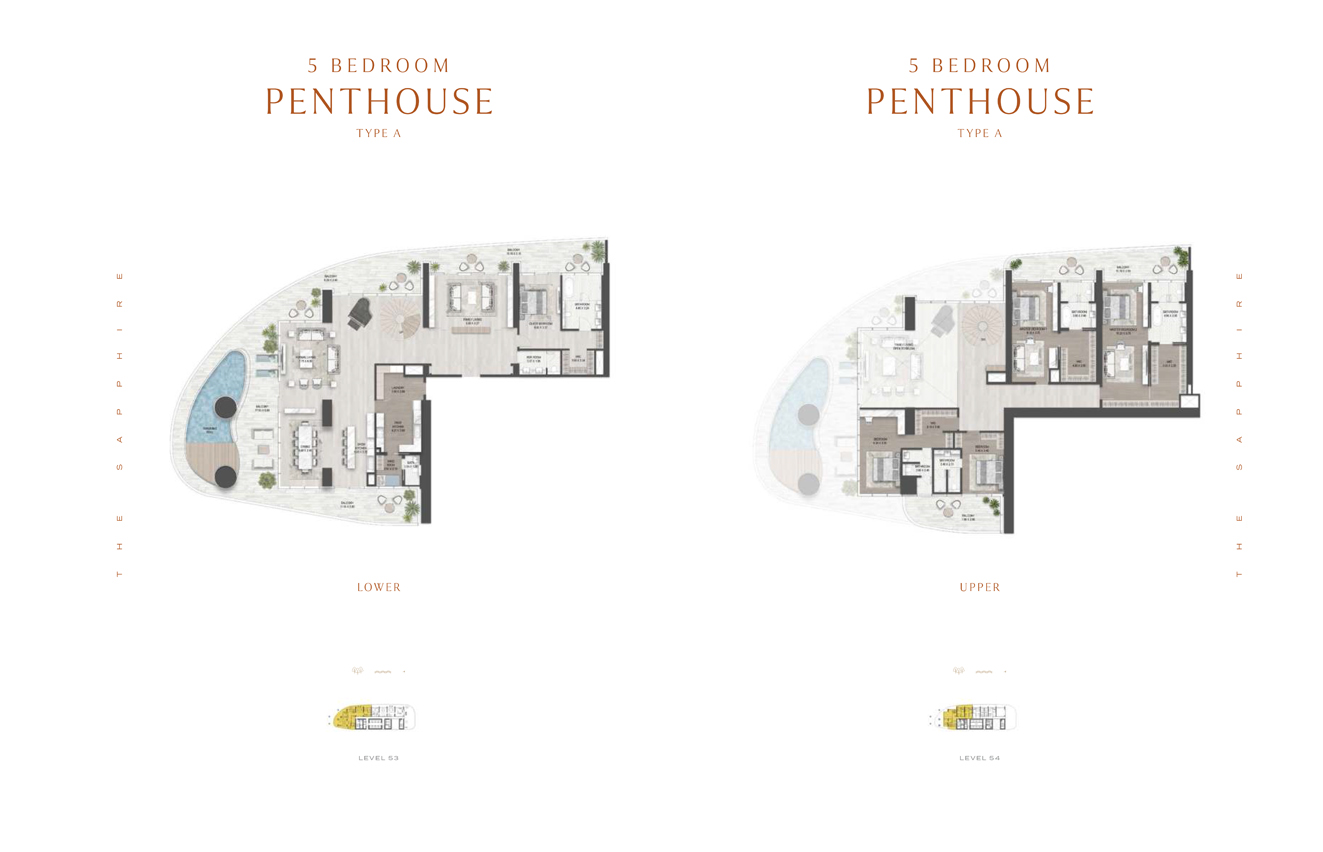 Upon arrival, residents and guests are greeted by a branded entrance area that sets the tone for the lavish lifestyle within. The ground level features captivating lobby areas designed to leave a lasting impression, while podium levels house exquisite townhouses, ensuring privacy and exclusivity. The fifth floor serves as a haven for relaxation and rejuvenation, with luxury spa retreats and a 24/7 gym catering to residents’ wellness needs. From the 6th to the 52nd floor, the luxury apartments await, each meticulously crafted to exude sophistication and comfort. For those seeking the epitome of luxury living, the 53rd and 54th floors boast exclusive sky penthouses, offering unparalleled views of the city skyline.