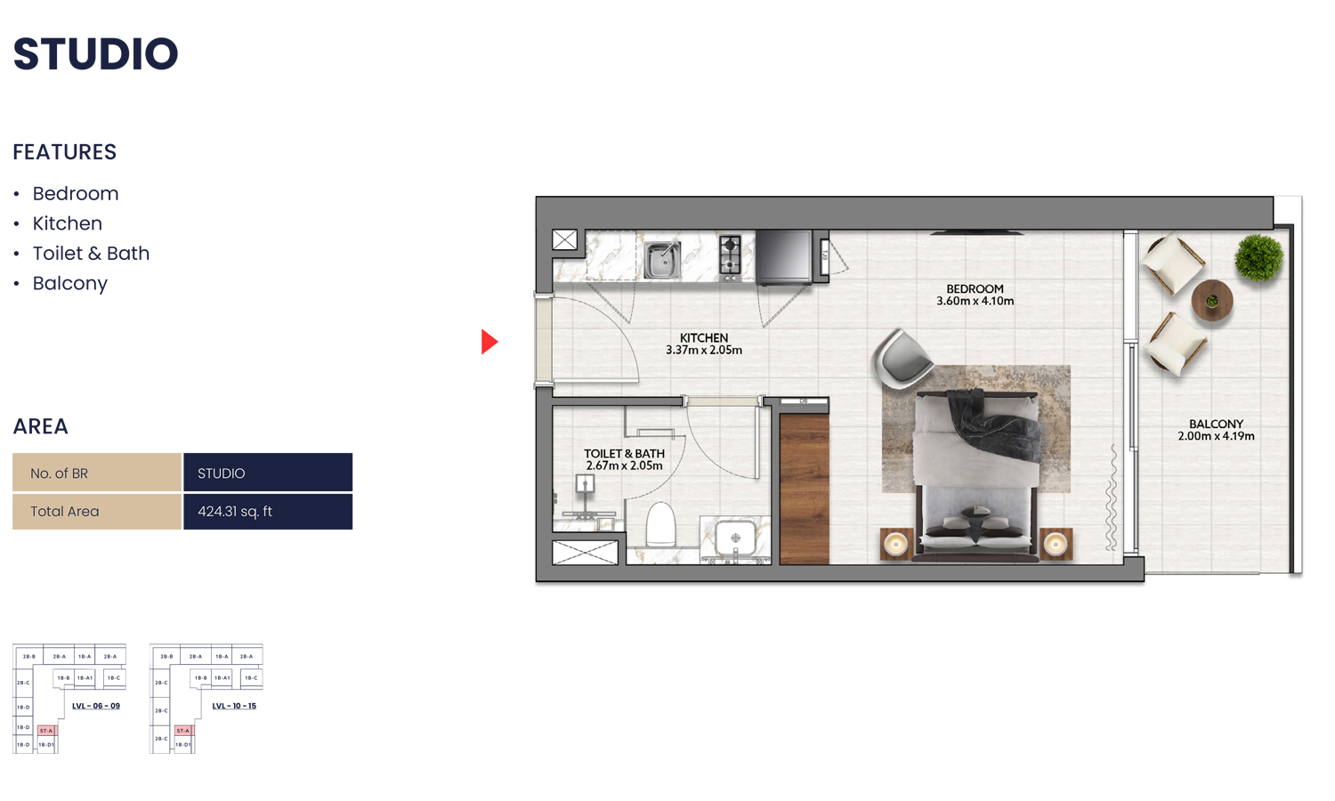 The complex features 144 residential units, among which are studios and 1-3 bedroom apartments. The properties will spread across 18 floors. The size of the units ranges from 400 sq. ft to 1,800 sq. ft. Depending on your preference, you can choose an apartment that is furnished or unfurnished.