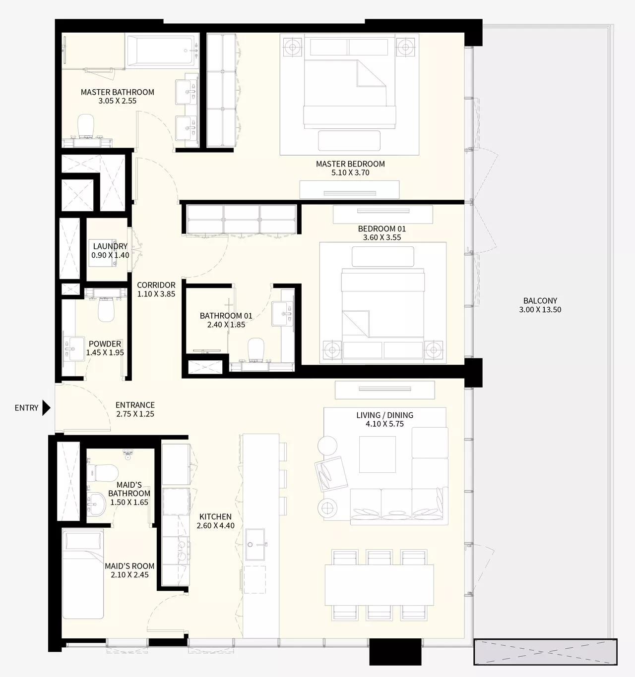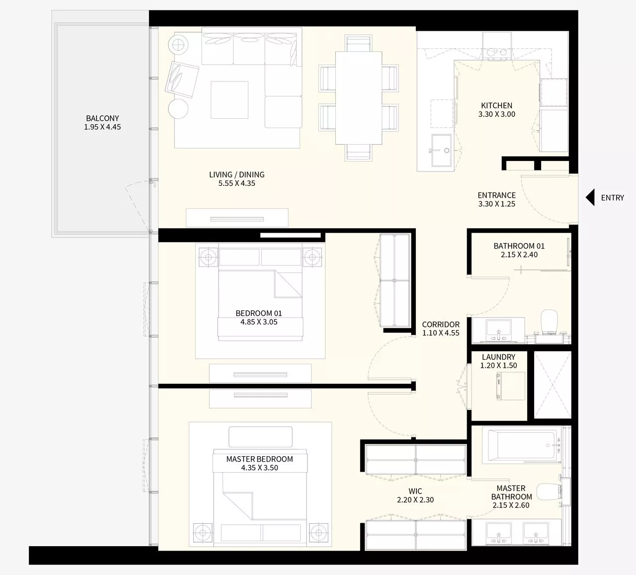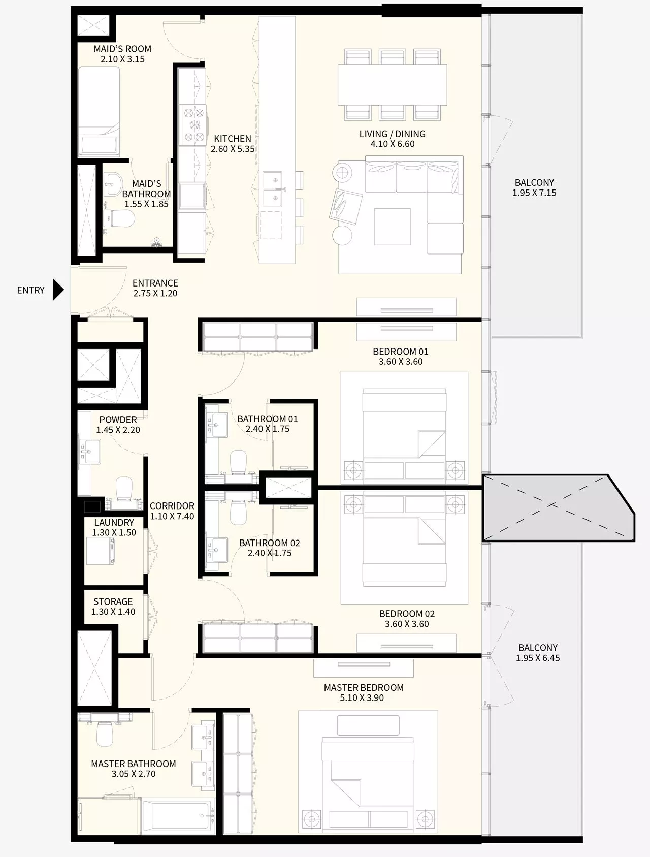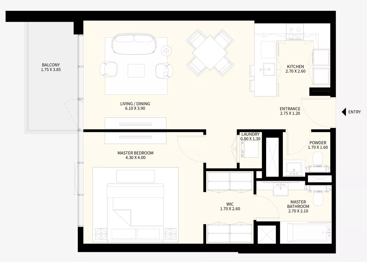You can choose from an array of stylish 1-3 bedroom apartments and just 6 luxury 4-bedroom penthouses. There are also spacious 3-bedroom villas on the ground floor. The property sizes range from 708 sq. ft to 4,510 sq. ft.